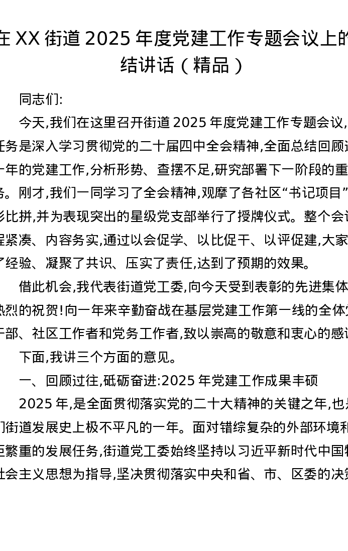 在XX街道2025年度党建工作专题会议上的总结讲话