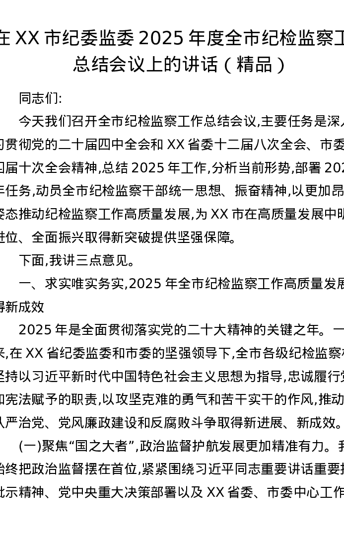 在XX市纪委监委2025年度全市纪检监察工作总结会议上的讲话