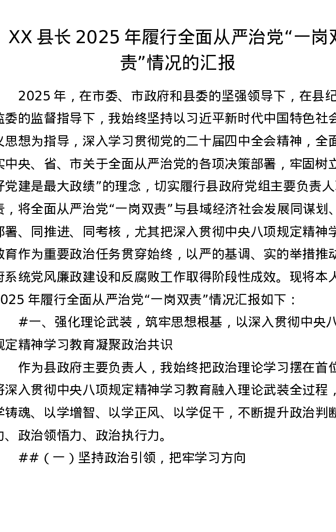 XX县长2025年履行全面从严治党一岗双责情况的汇报(7537字)