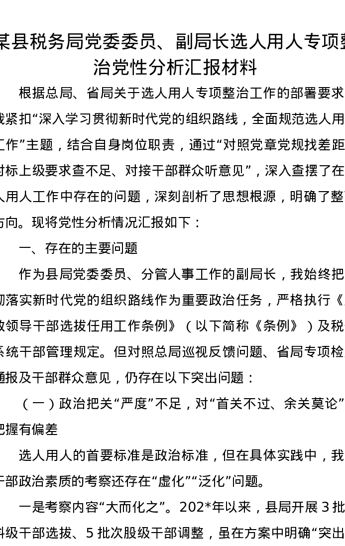某县税务局党委委员、副局长选人用人专项整治党性分析汇报材料