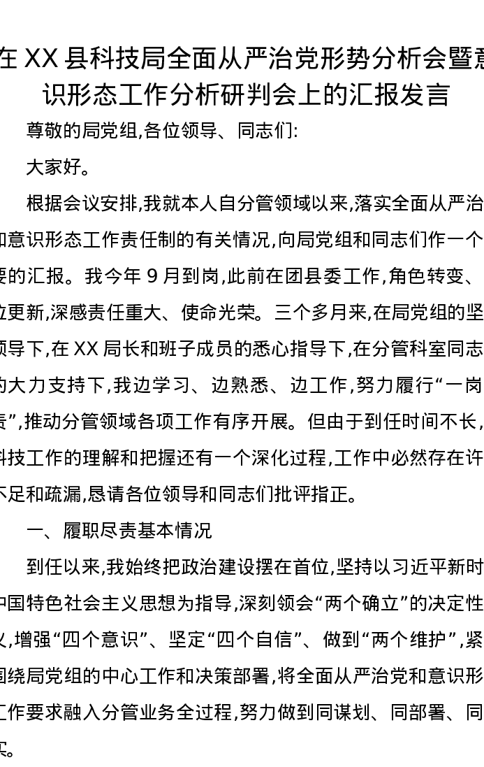 在XX县科技局全面从严治党形势分析会暨意识形态工作分析研判会上的汇报发言