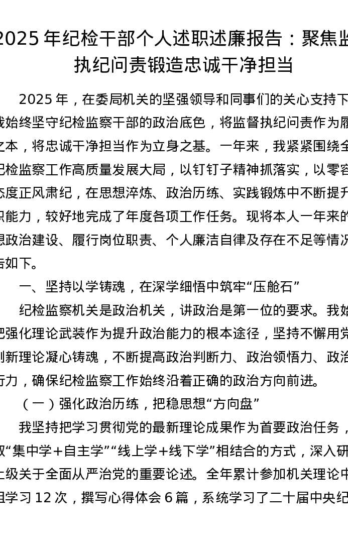 2025年纪检干部个人述职述廉报告:聚焦监督执纪问责 锻造忠诚干净担当