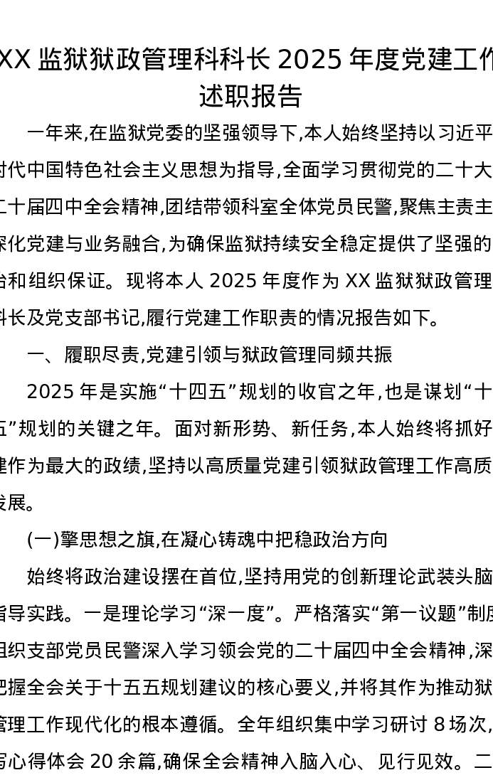 XX监狱狱政管理科科长2025年度党建工作述职报告