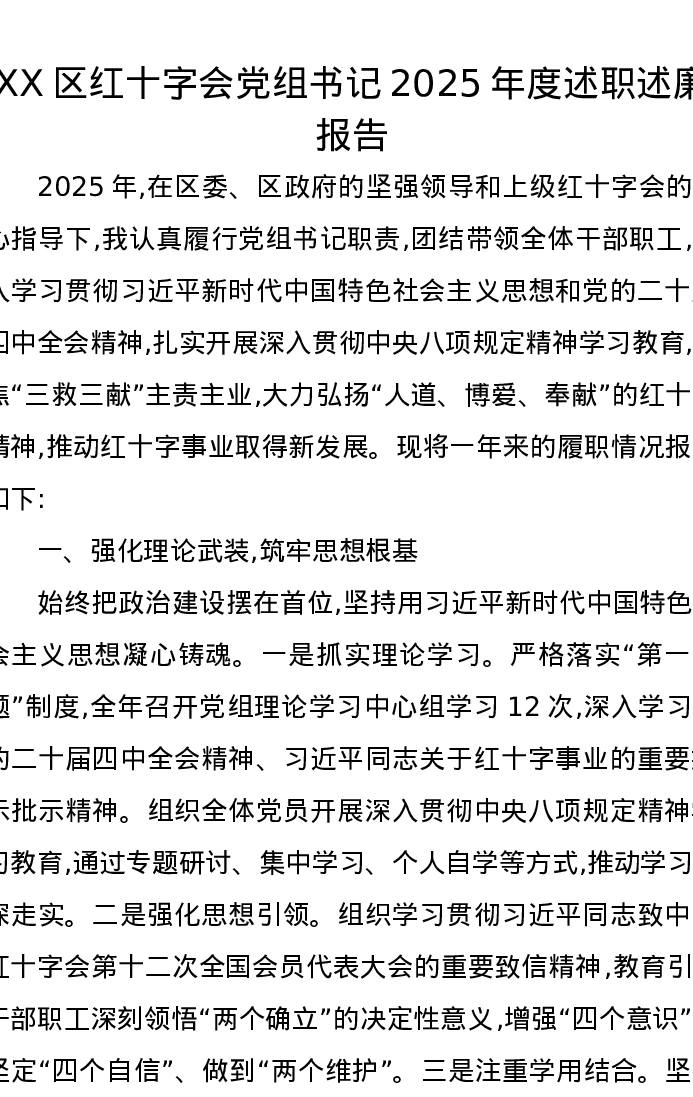 XX区红十字会党组书记2025年度述职述廉报告