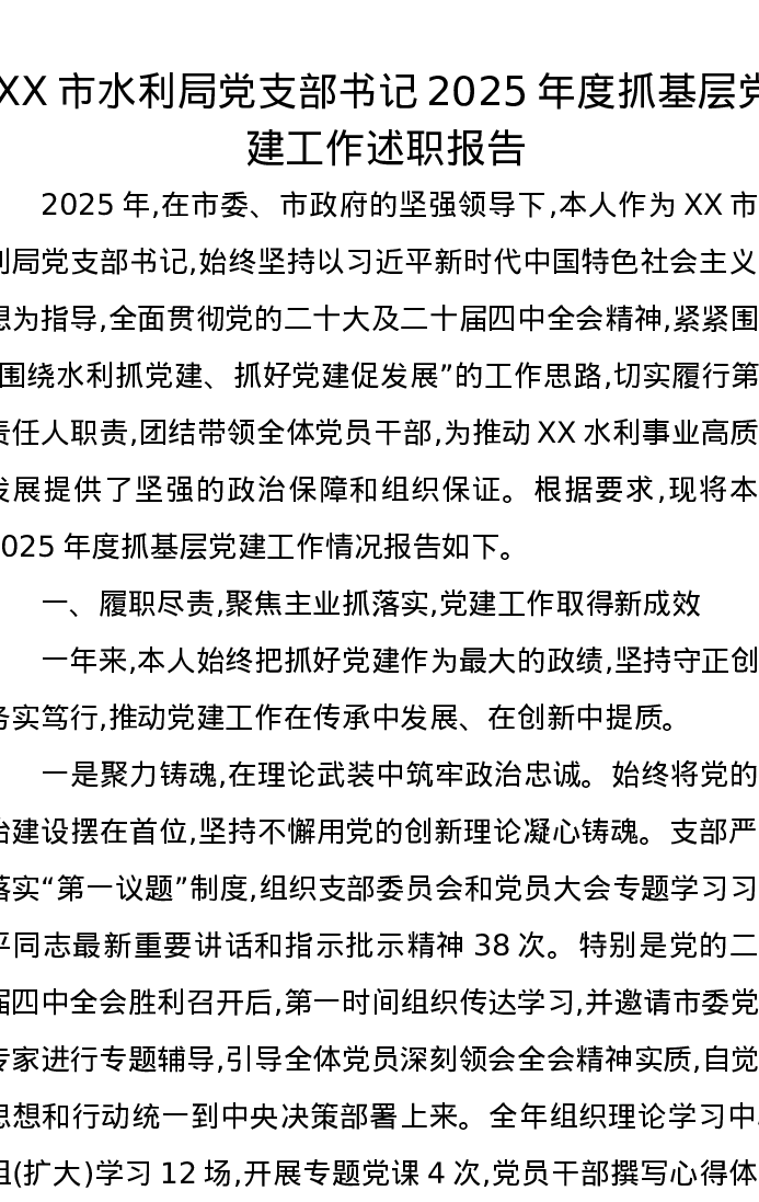 XX市水利局党支部书记2025年度抓基层党建工作述职报告