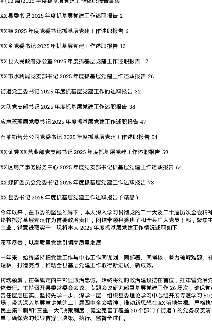汇编:2025年度抓基层党建工作述职报告合集12篇