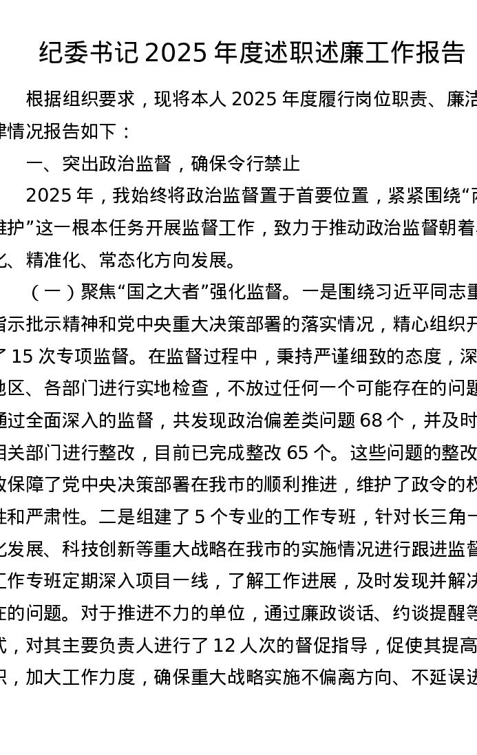 纪委书记2025年度述职述廉工作报告