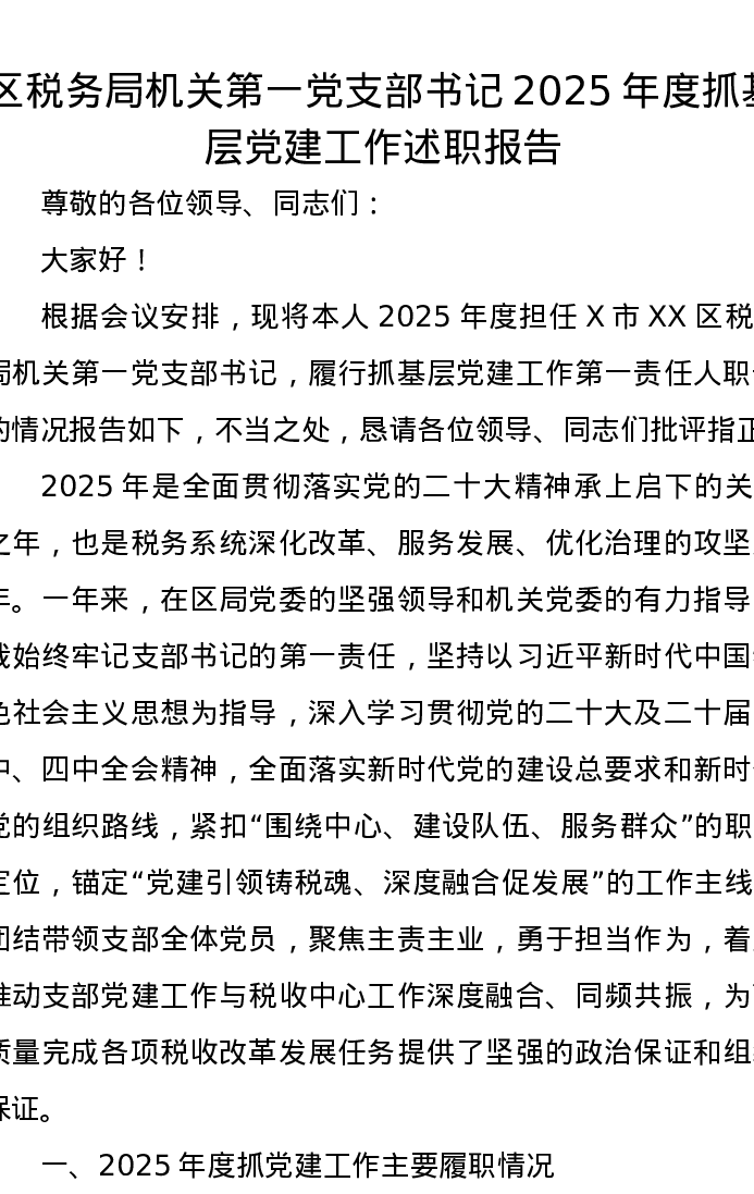 区税务局机关第一党支部书记2025年度抓基层党建工作述职报告