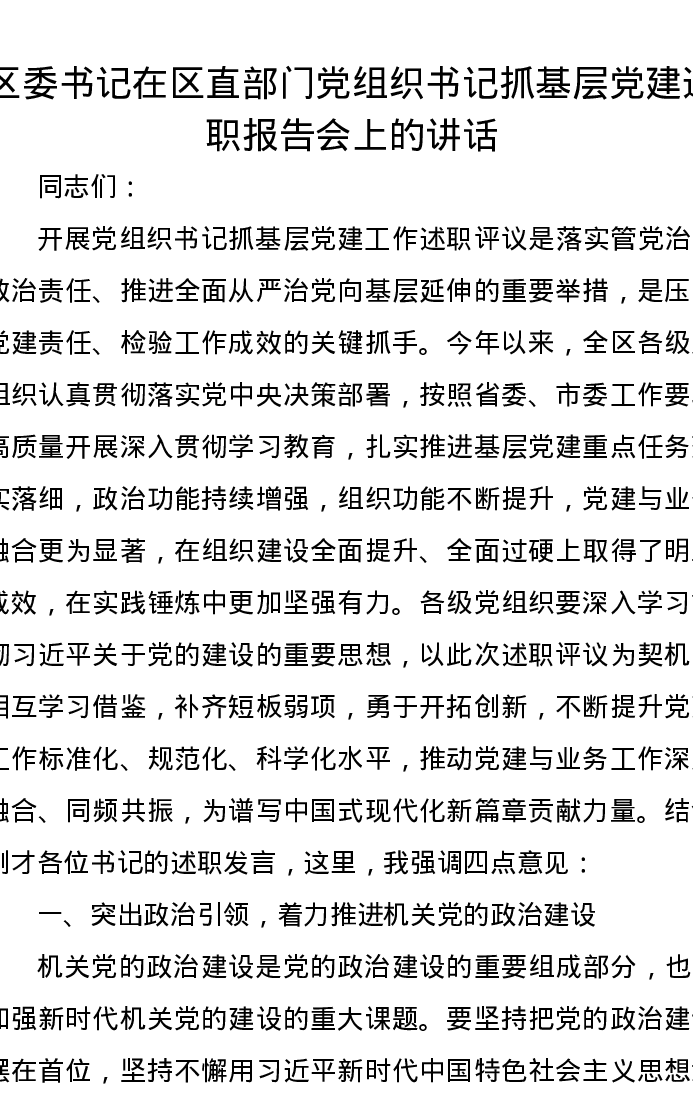 区委书记在区直部门党组织书记抓基层党建述职报告会上的讲话