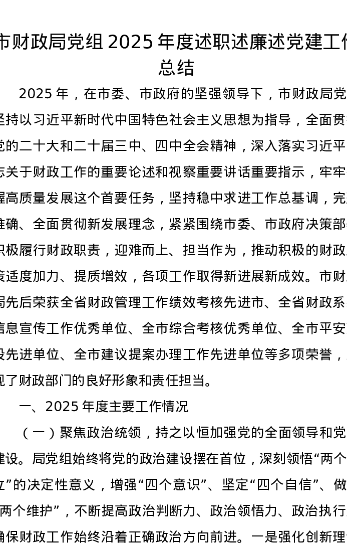 市财政局党组2025年度述职述廉述党建工作总结