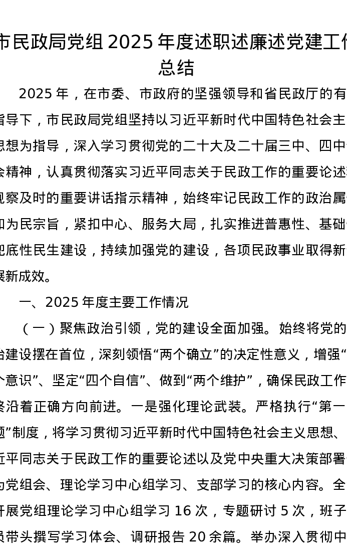 市民政局党组2025年度述职述廉述党建工作总结