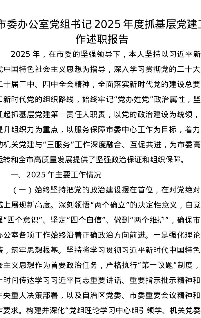 市委办公室党组书记2025年度抓基层党建工作述职报告