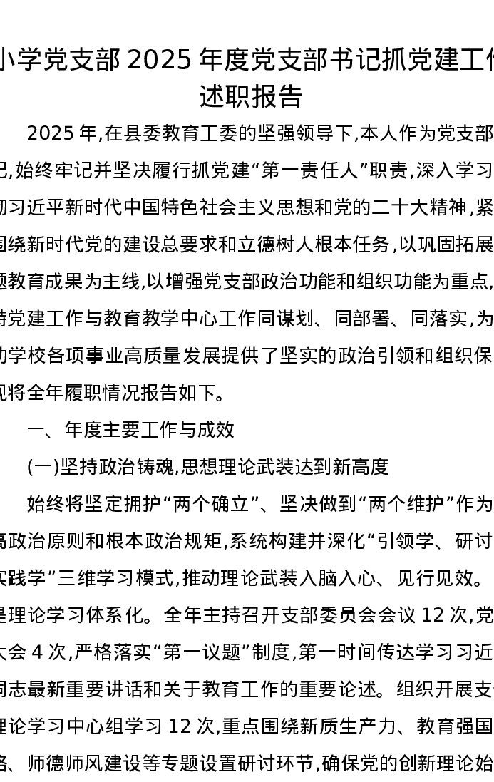 小学党支部2025年度党支部书记抓党建工作述职报告