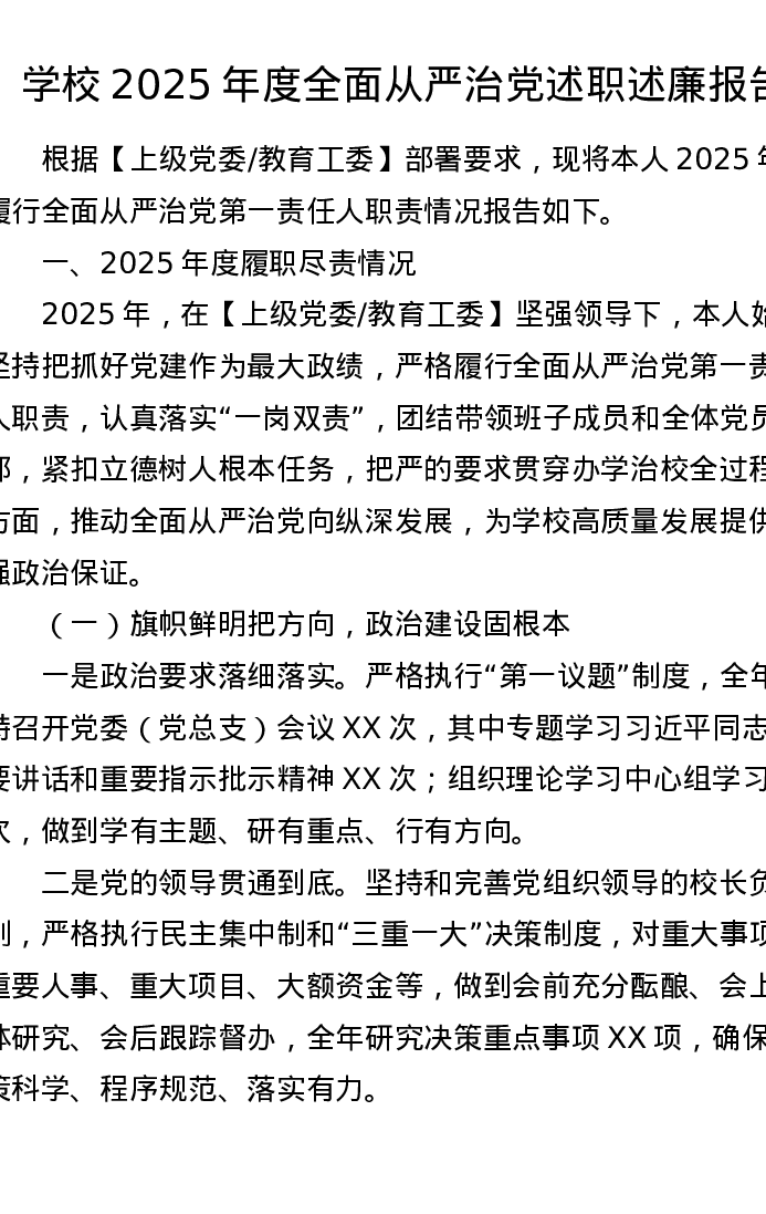学校2025年度全面从严治党述职述廉报告(3697字)