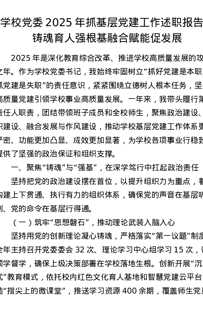 学校党委2025年抓基层党建工作述职报告:铸魂育人强根基 融合赋能促发展
