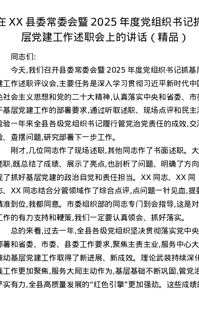 在XX县委常委会暨2025年度党组织书记抓基层党建工作述职会上的讲话