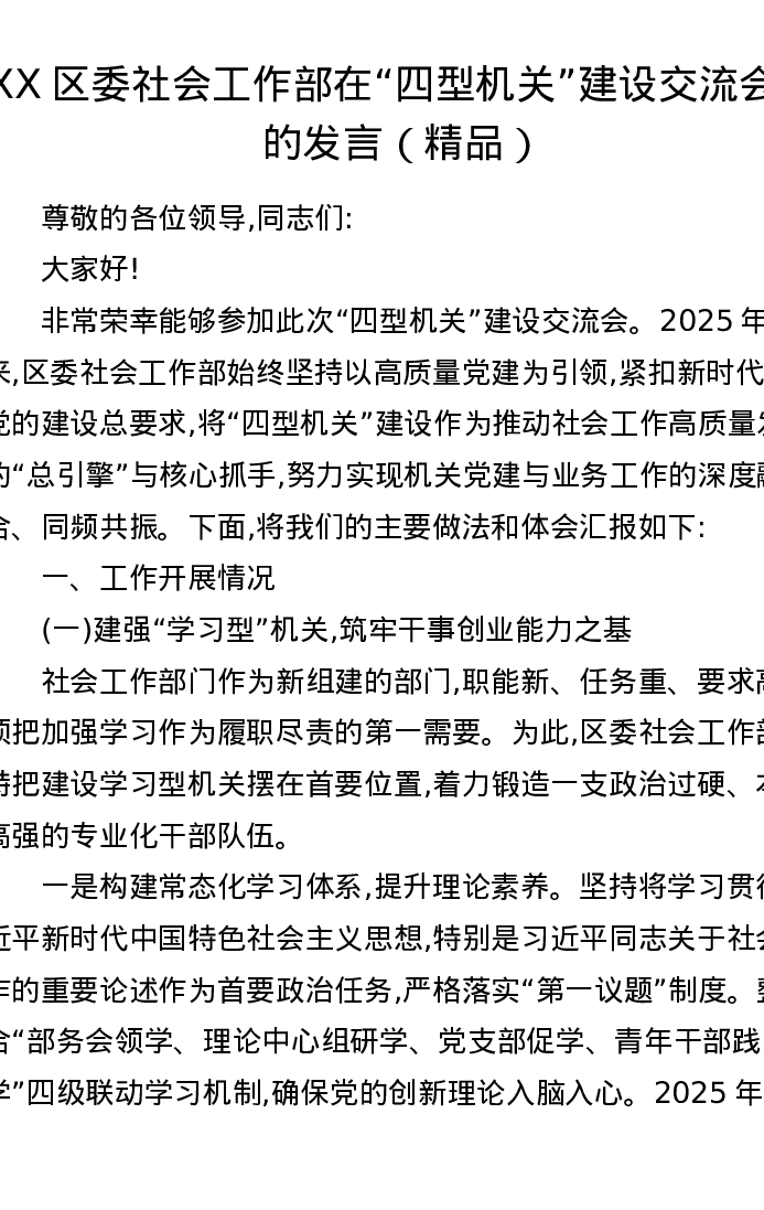 XX区委社会工作部在四型机关建设交流会上的发言
