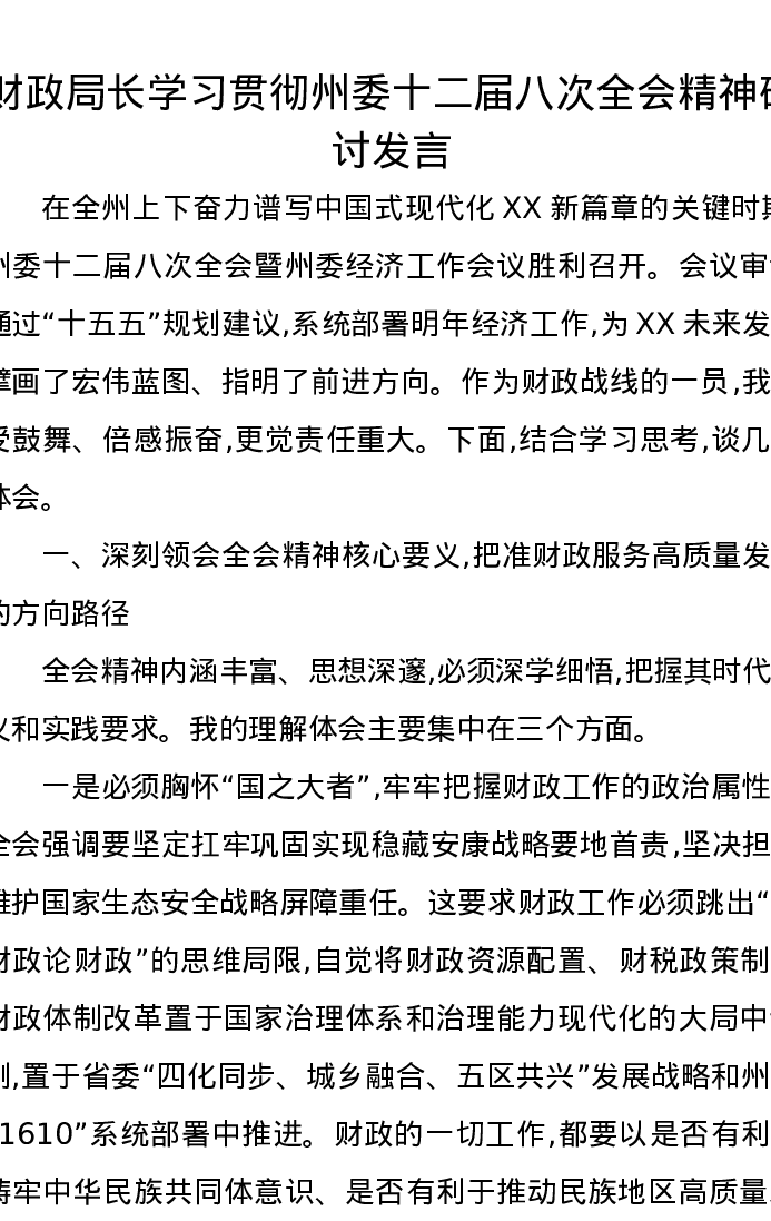 财政局长学习贯彻州委十二届八次全会精神研讨发言