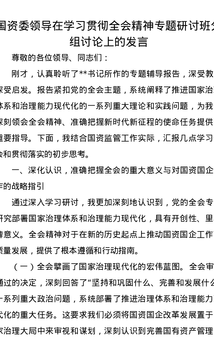 国资委领导在学习贯彻全会精神专题研讨班分组讨论上的发言