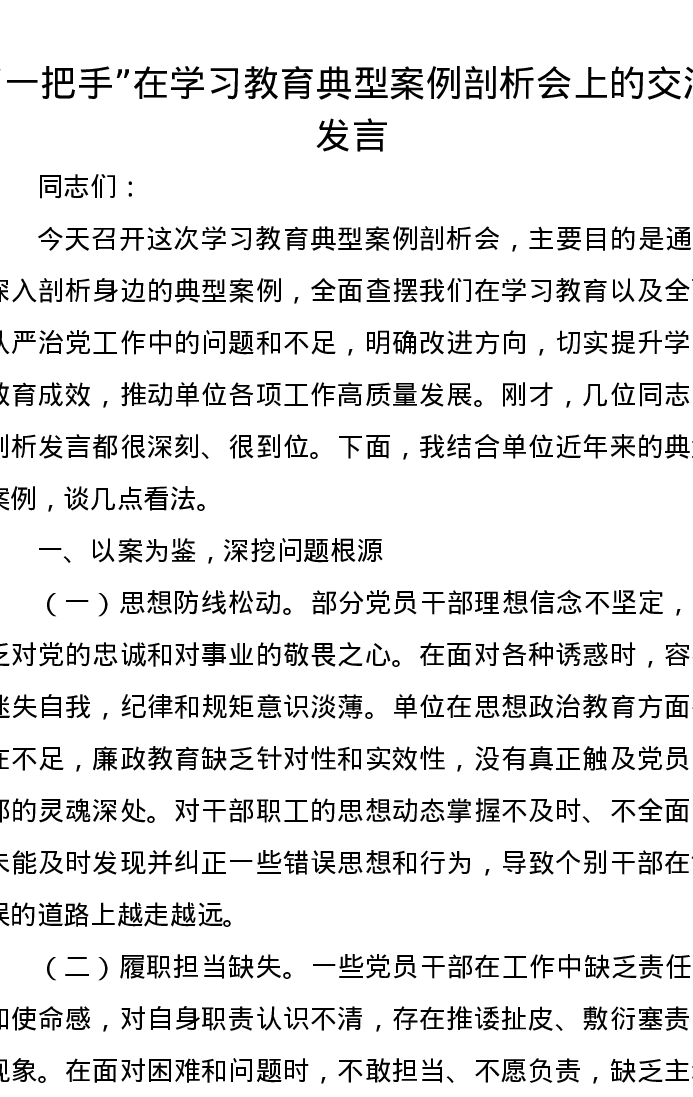 一把手在学习教育典型案例剖析会上的交流发言