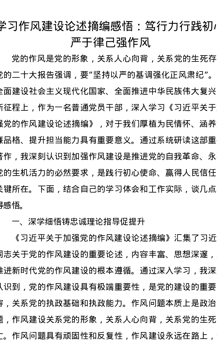 学习作风建设论述摘编感悟:笃行力行践初心 严于律己强作风