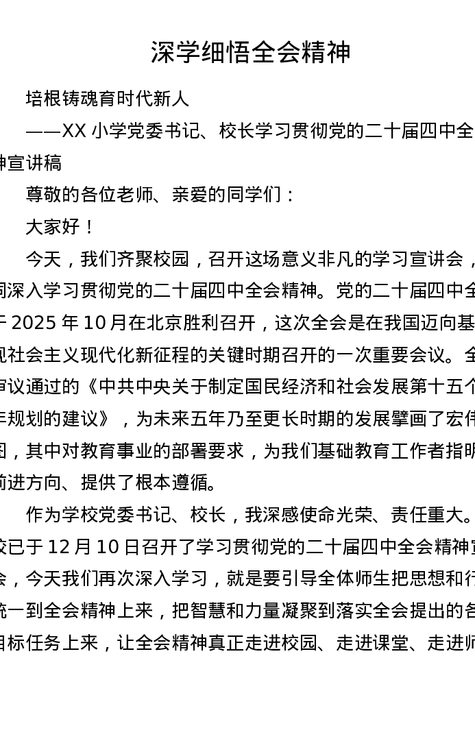 XX小学党委书记、校长关于党的二十届四中全会精神的宣讲稿(9379字)