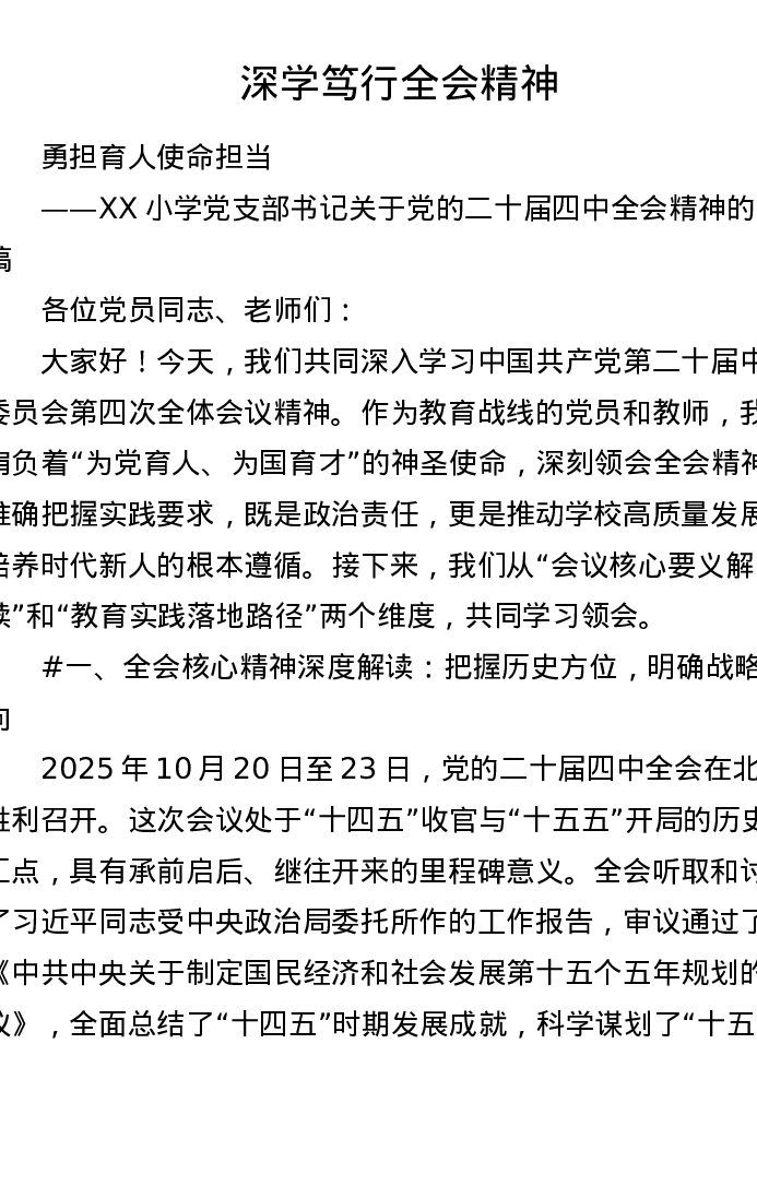 XX小学党支部书记关于党的二十届四中全会精神的宣讲稿(4756字)