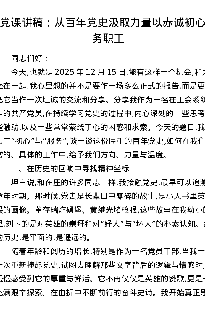 党课讲稿:从百年党史汲取力量 以赤诚初心服务职工