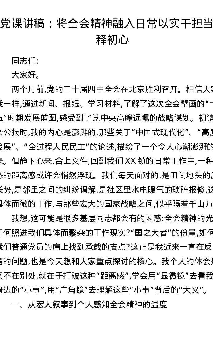 党课讲稿:将全会精神融入日常 以实干担当诠释初心