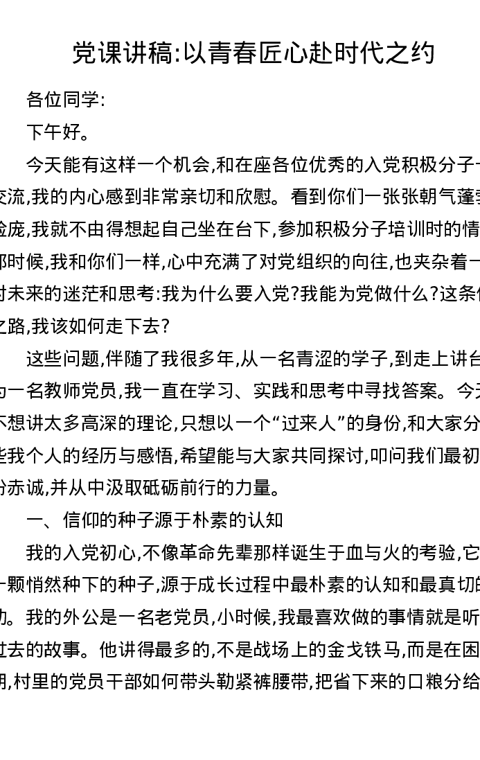 党课讲稿:以青春匠心赴时代之约