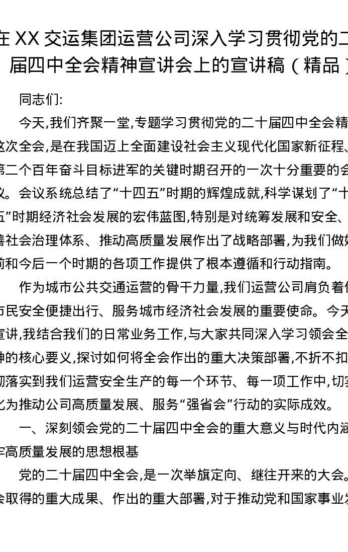 在XX交运集团运营公司深入学习贯彻党的二十届四中全会精神宣讲会上的宣讲稿