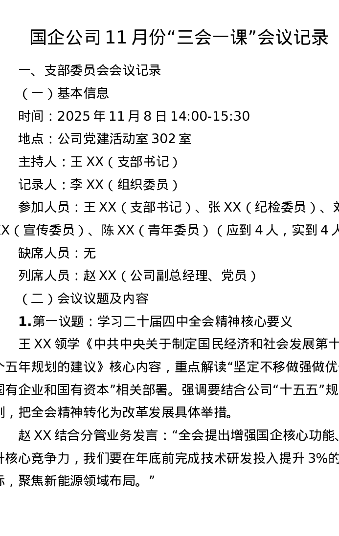 国企公司11月份三会一课会议记录