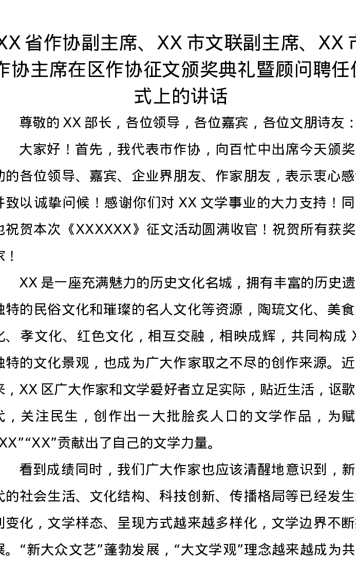 XX省作协副主席、XX市文联副主席、XX市作协主席在区作协征文颁奖典礼暨顾问聘任仪式上的讲话