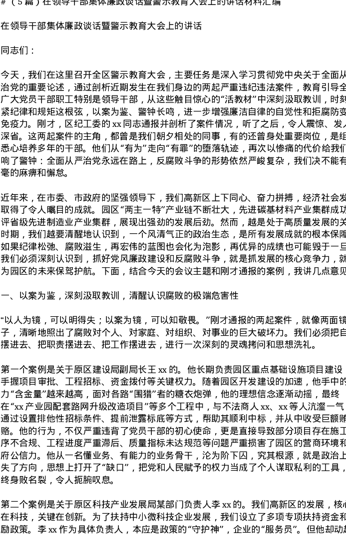 汇编:在领导干部集体廉政谈话暨警示教育大会上的讲话5篇
