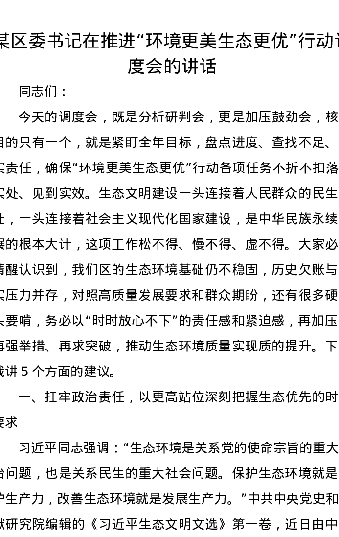 某区委书记在推进环境更美 生态更优行动调度会的讲话