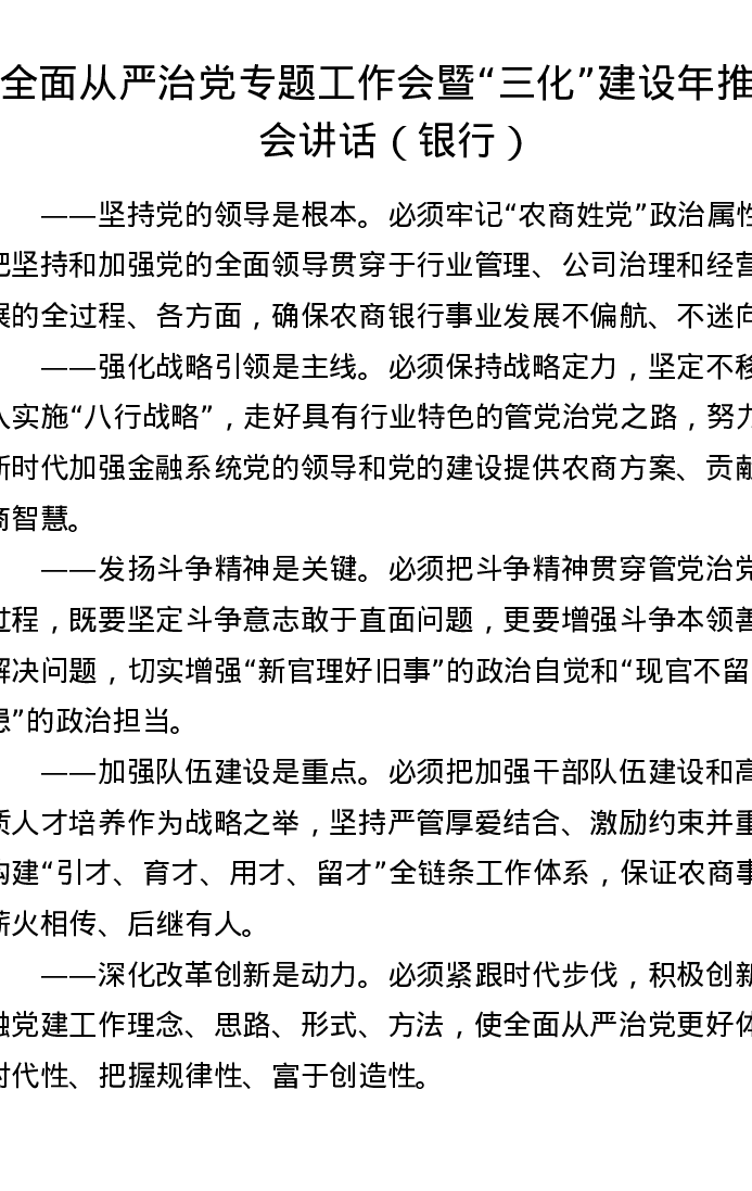 全面从严治党专题工作会暨三化建设年推进会讲话(银行)