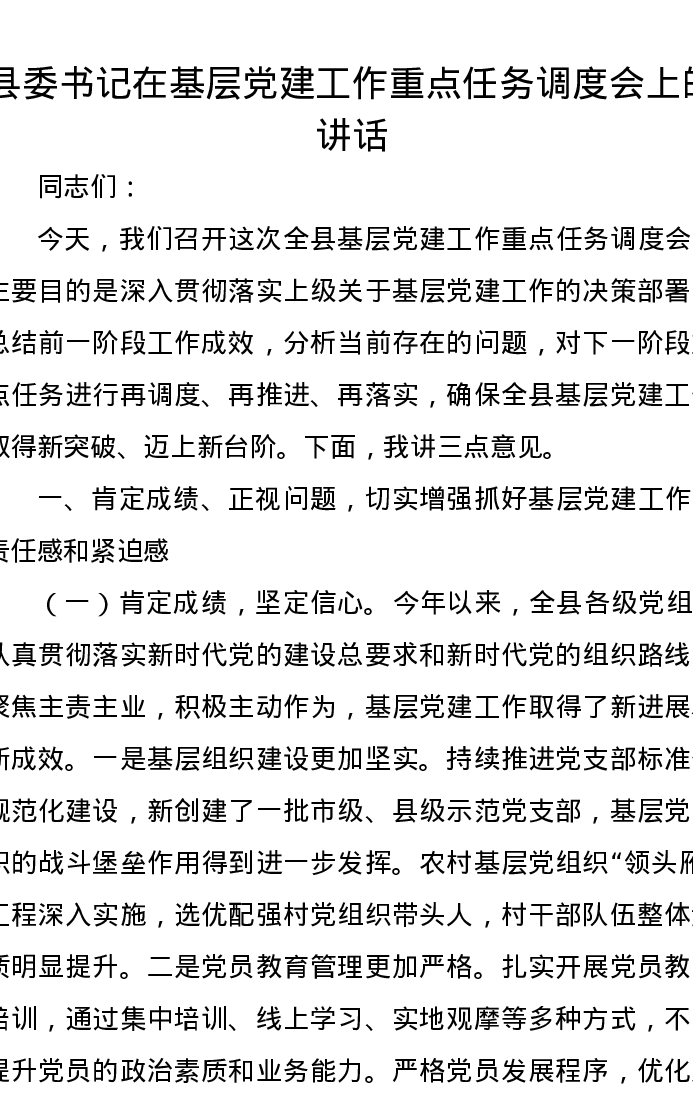 县委书记在基层党建工作重点任务调度会上的讲话
