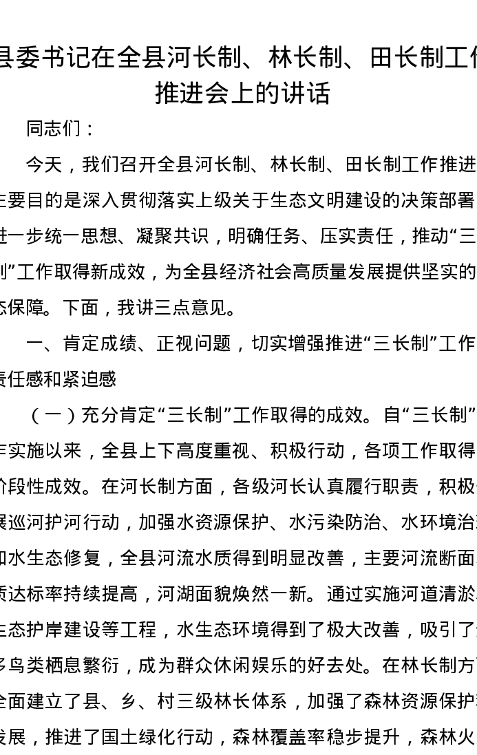县委书记在全县河长制、林长制、田长制工作推进会上的讲话