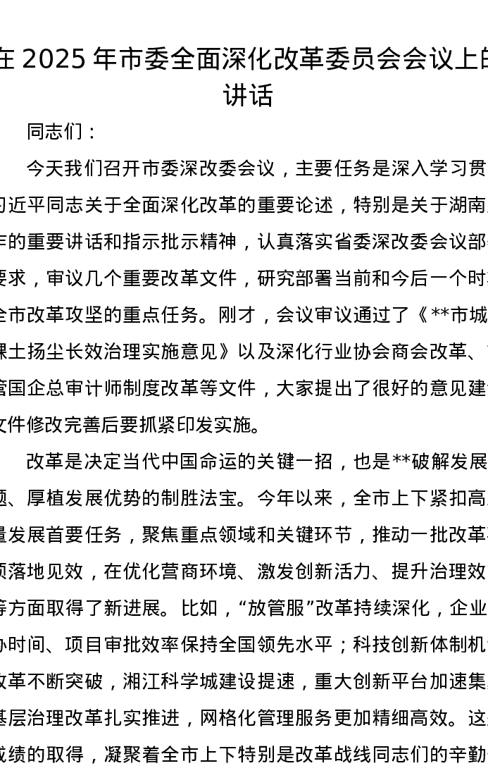 在2025年市委全面深化改革委员会会议上的讲话