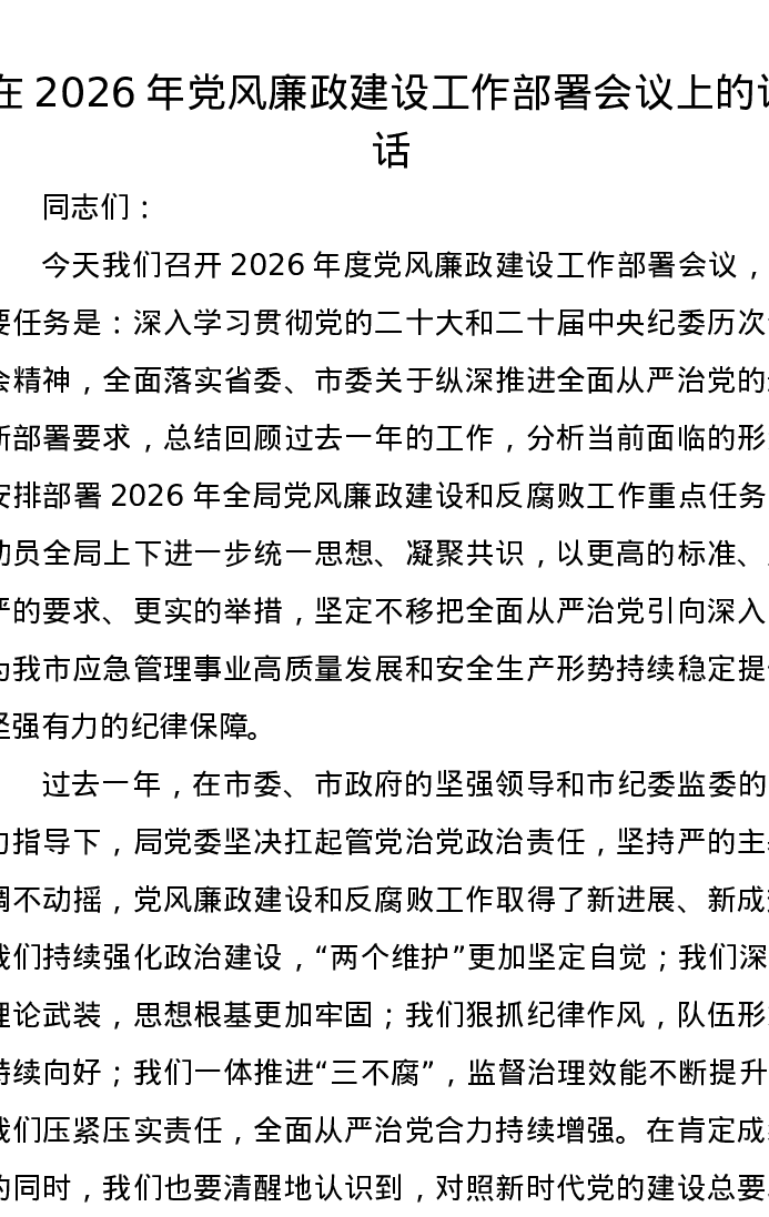 在2026年党风廉政建设工作部署会议上的讲话