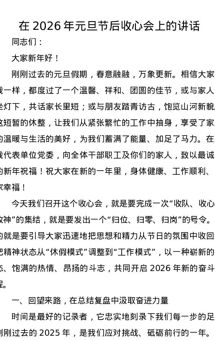 在2026年元旦节后收心会上的讲话