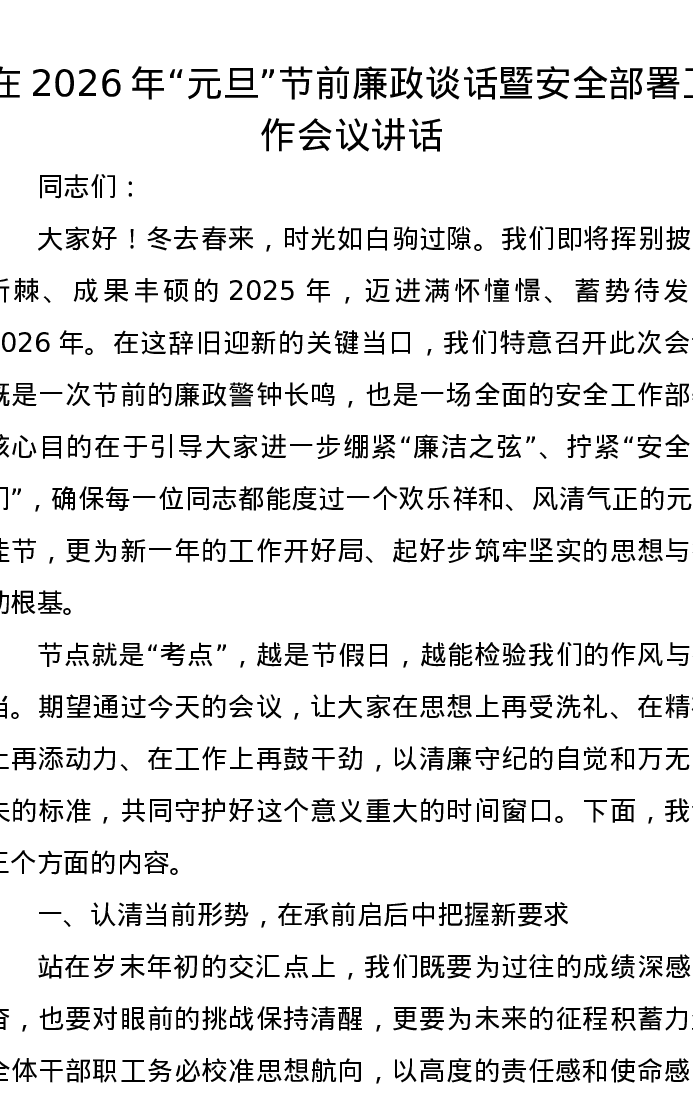 在2026年元旦节前廉政谈话暨安全部署工作会议讲话