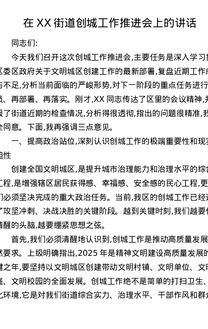 在XX街道创城工作推进会上的讲话