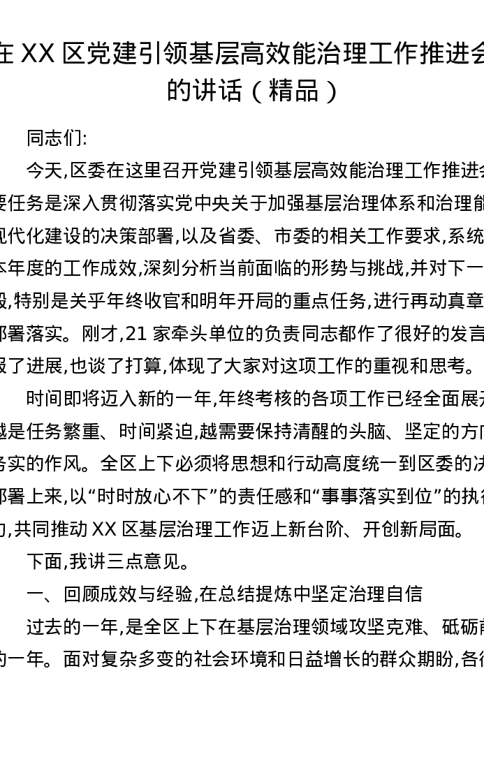 在XX区党建引领基层高效能治理工作推进会上的讲话