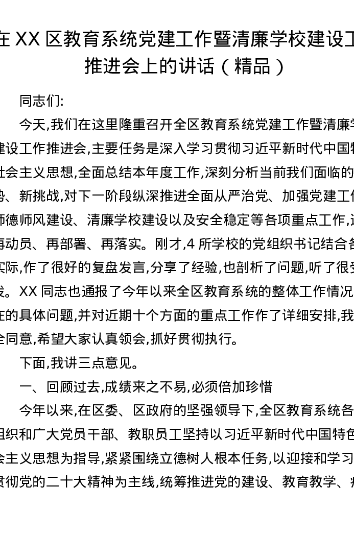 在XX区教育系统党建工作暨清廉学校建设工作推进会上的讲话