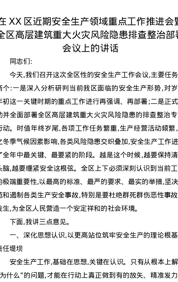 在XX区近期安全生产领域重点工作推进会暨全区高层建筑重大火灾风险隐患排查整治部署会议上的讲话