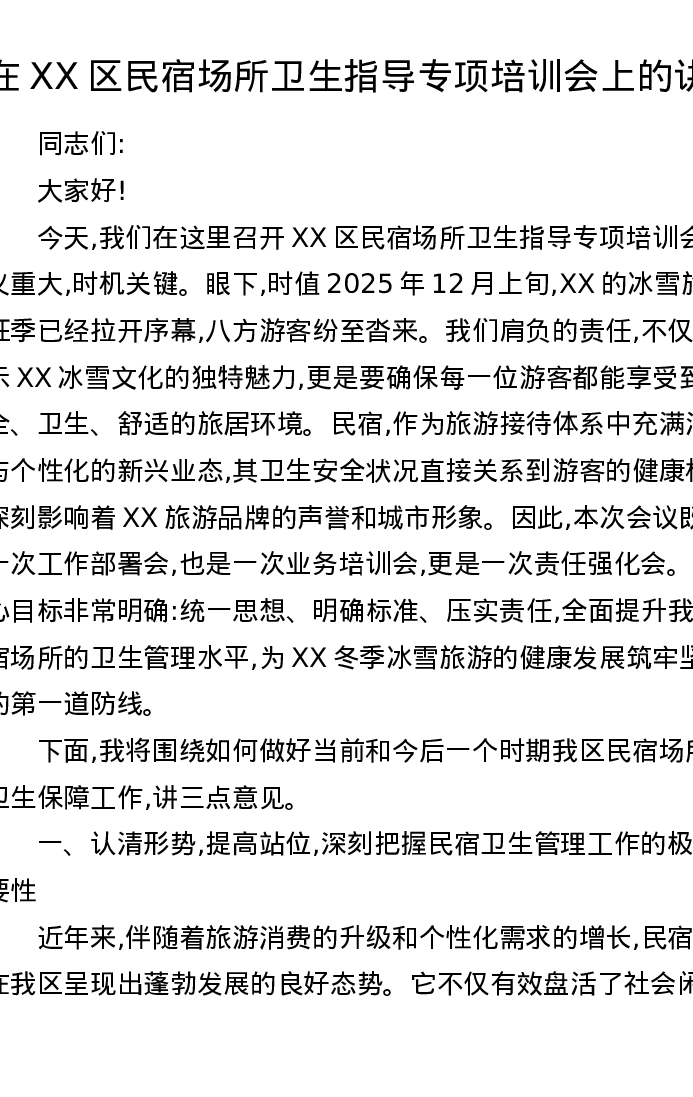 在XX区民宿场所卫生指导专项培训会上的讲话