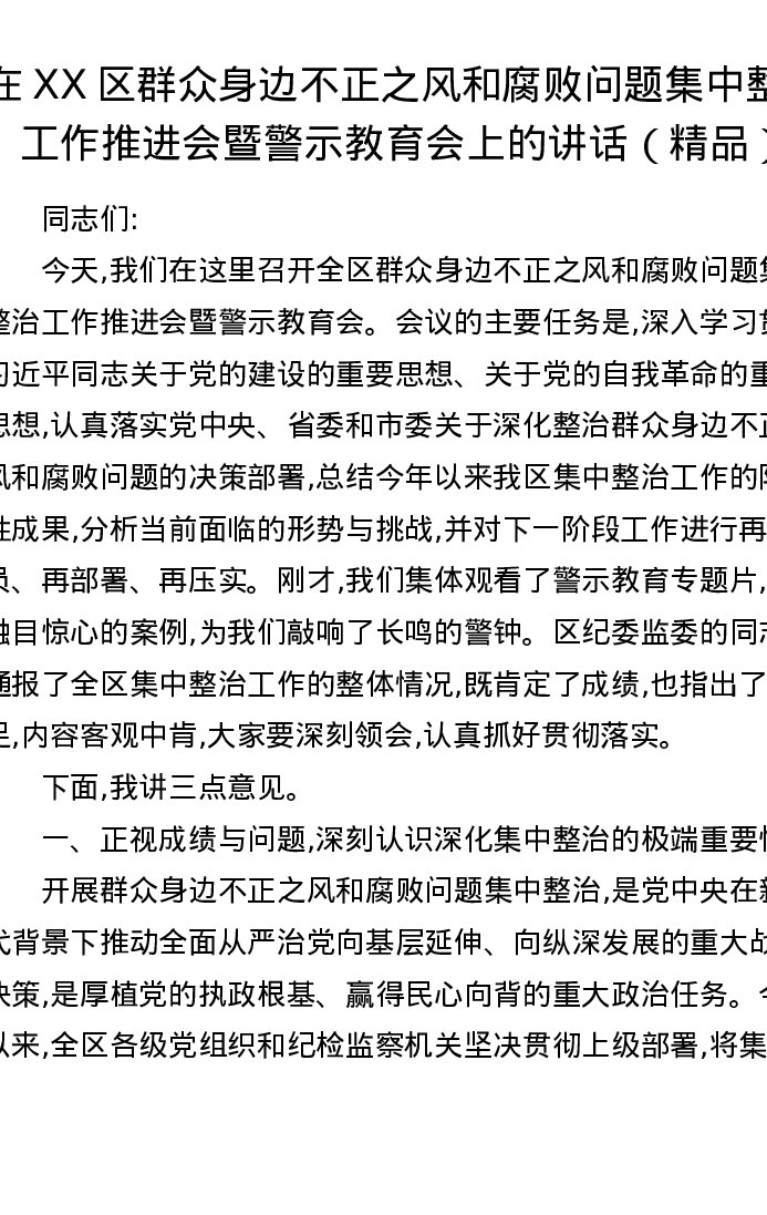 在XX区群众身边不正之风和腐败问题集中整治工作推进会暨警示教育会上的讲话