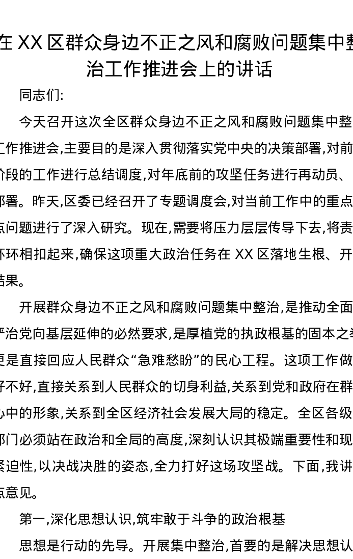 在XX区群众身边不正之风和腐败问题集中整治工作推进会上的讲话2