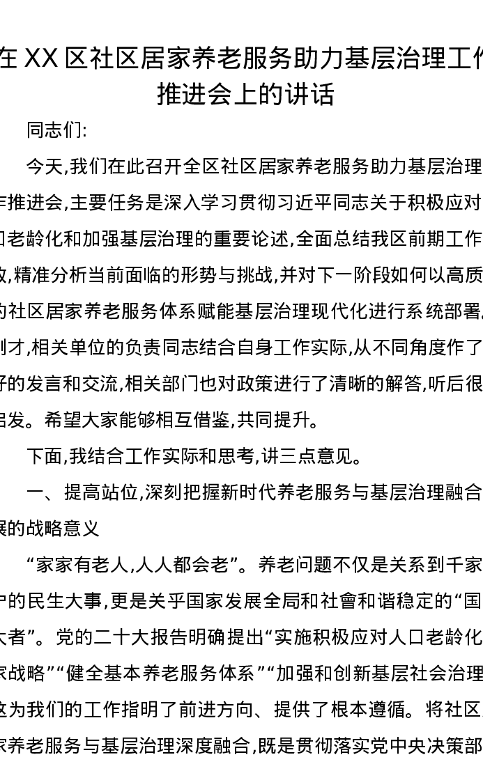 在XX区社区居家养老服务助力基层治理工作推进会上的讲话2